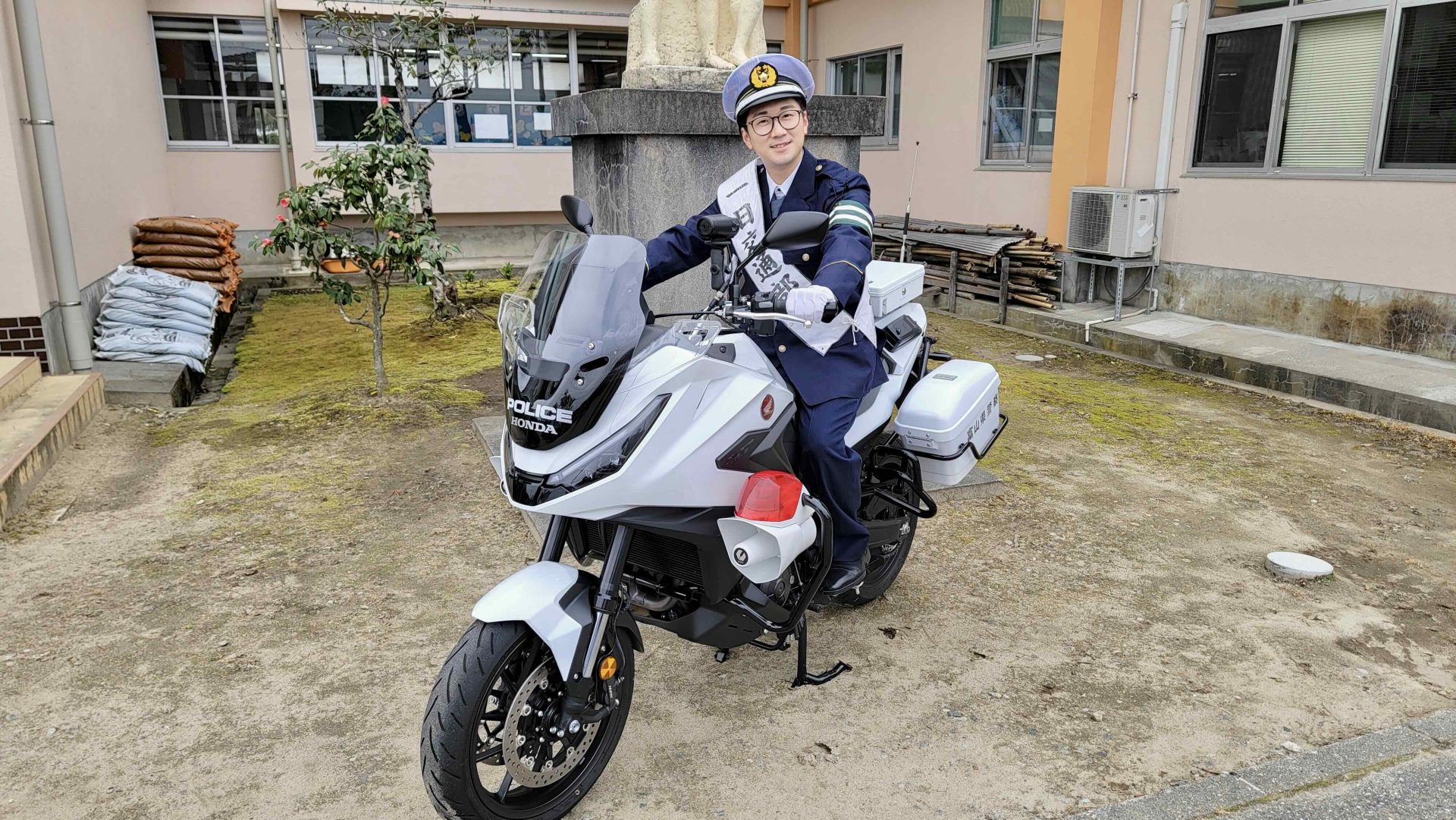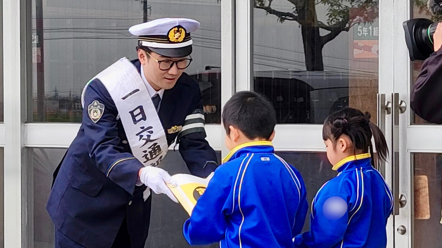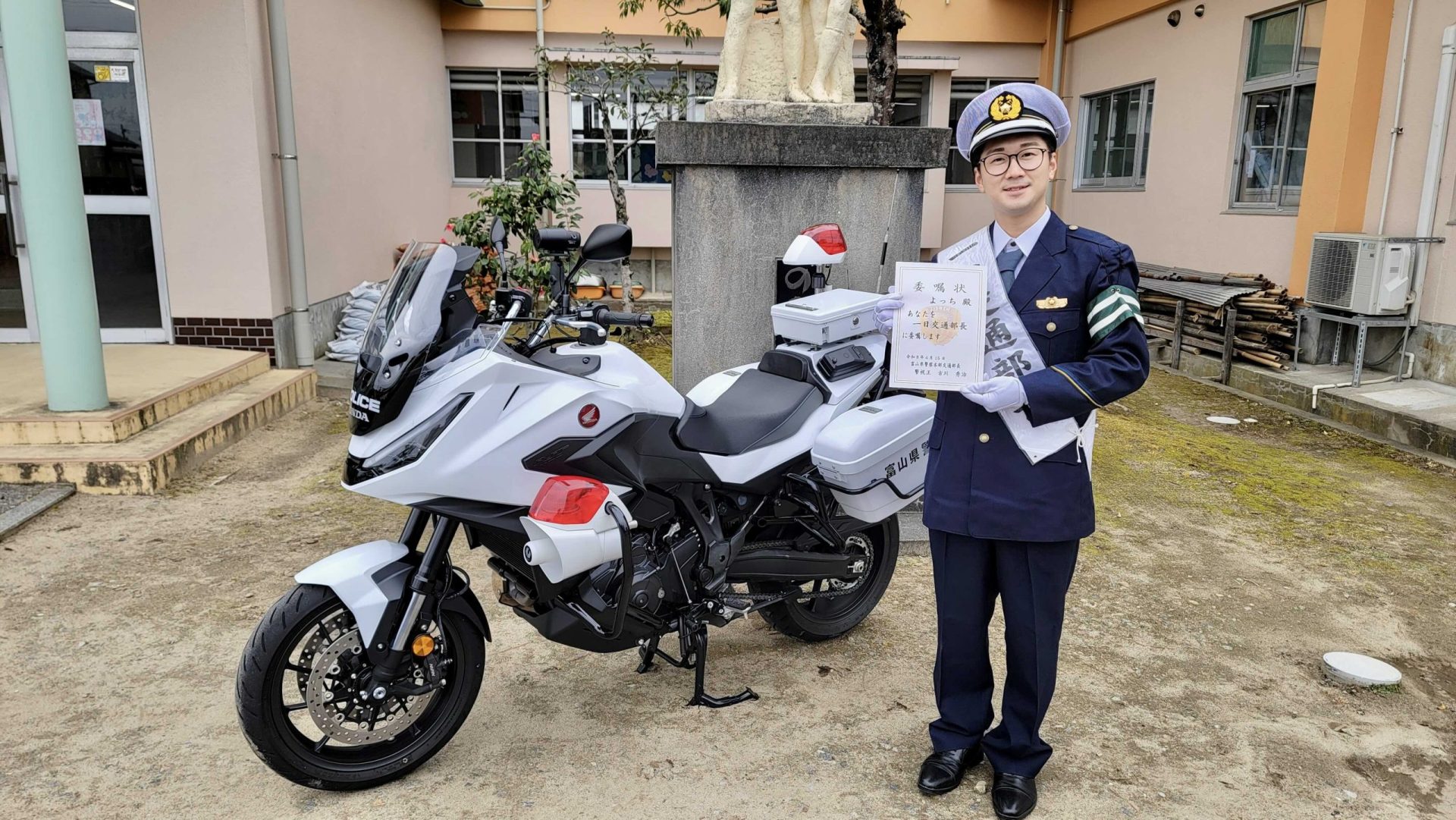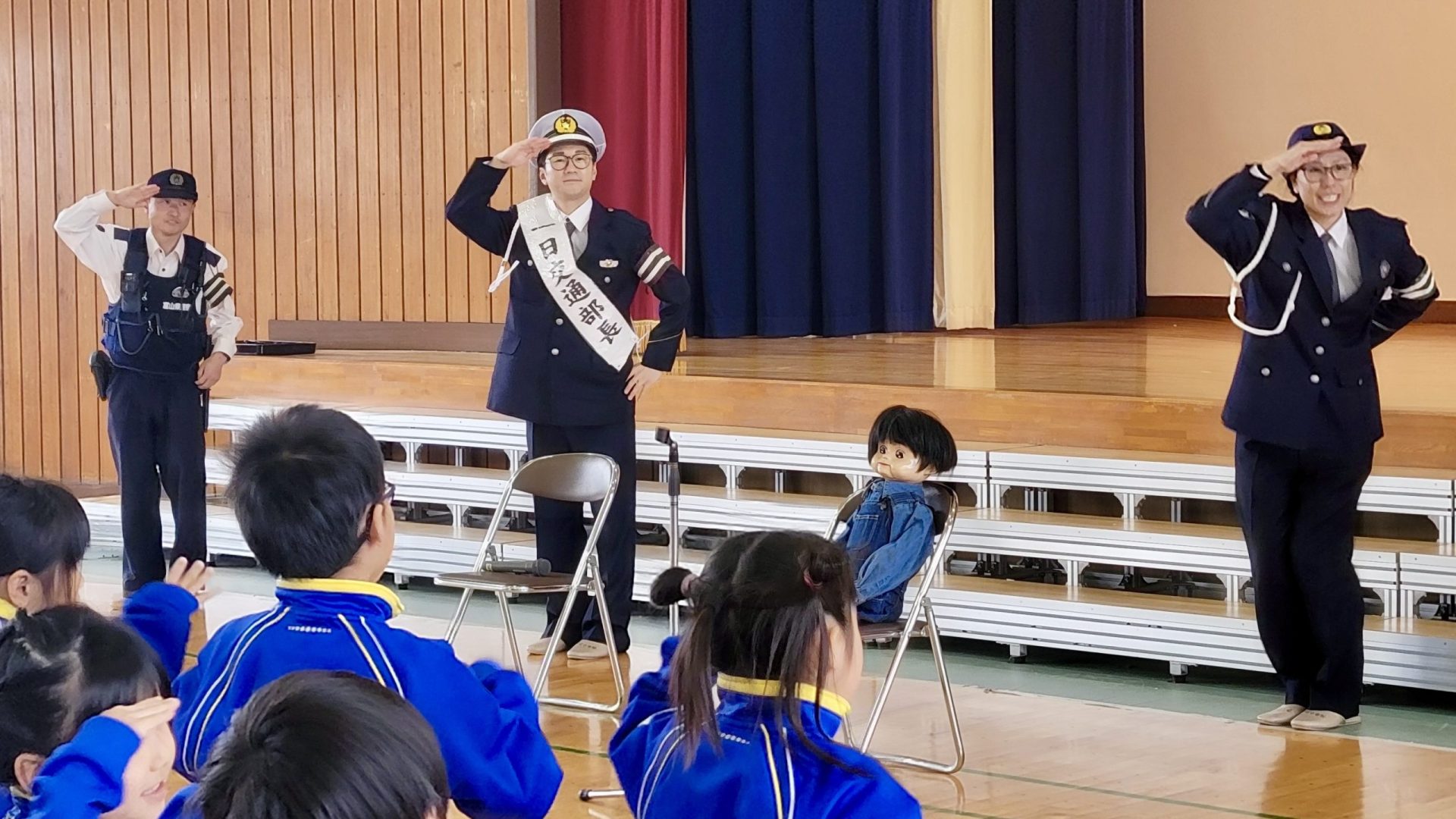 イベントは、よっちの母校である南条小学校の体育館にて、新1年生およそ50名を集めて行われました 。児童たちからの温かい拍手で迎えられながら、「一日交通部長」の委嘱式では、富山県警察本部交通部長より委嘱状が読み上げられ、よっちの胸に「一日交通部長」のタスキがかけられました 。